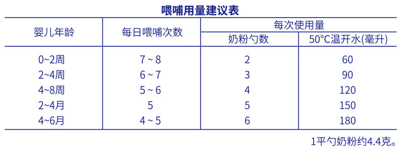 平勺奶粉 依照喂哺用量建議表,加入正確份量(平勺)的奶粉,請勿刻意壓平量勺。